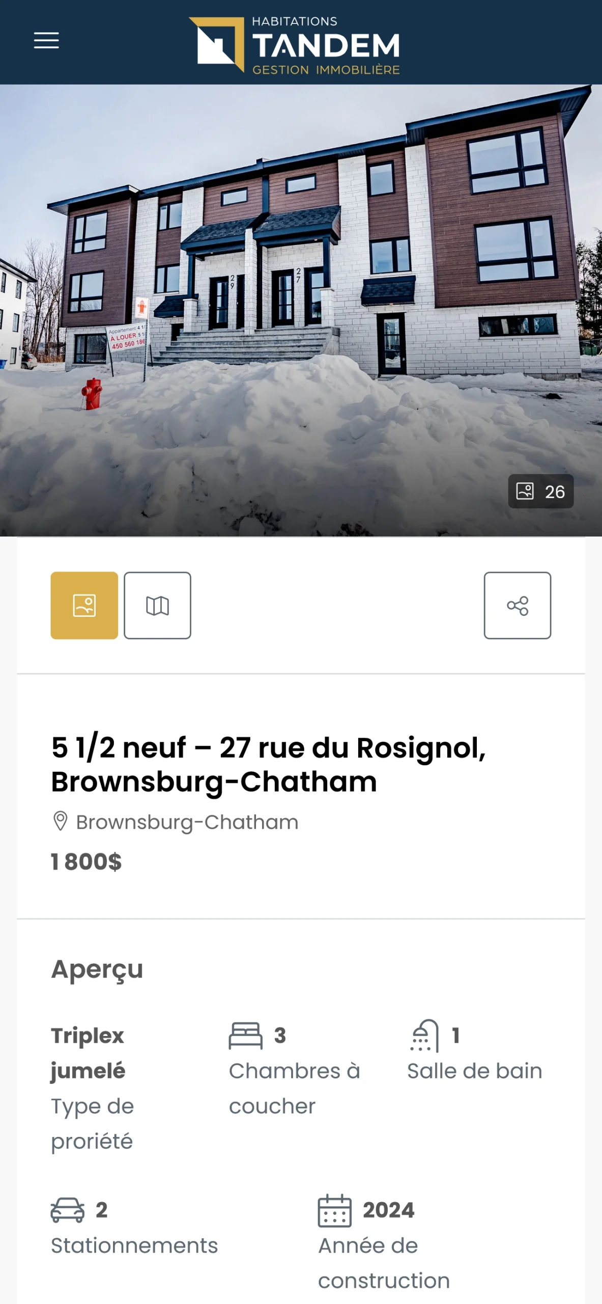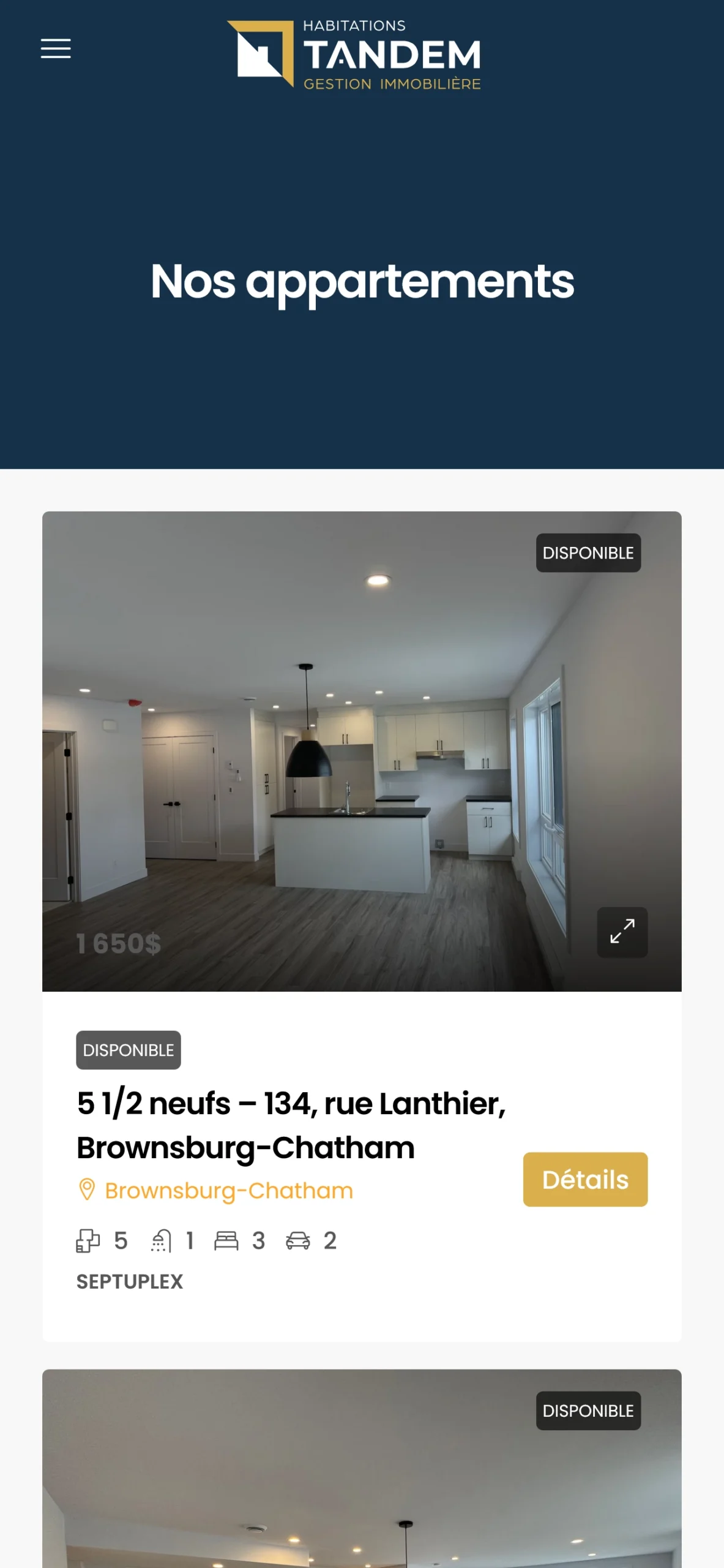 Habitations Tandem souhaitait structurer son image de marque et se doter d’un site web dédié à la mise en valeur de ses propriétés locatives. Le mandat comprenait la création du logo ainsi que le déploiement d’une plateforme web permettant de consulter facilement les logements disponibles. L’objectif était d’offrir une expérience claire et intuitive, facilitant la recherche d’unités et l’accès à l’information pour les futurs locataires.